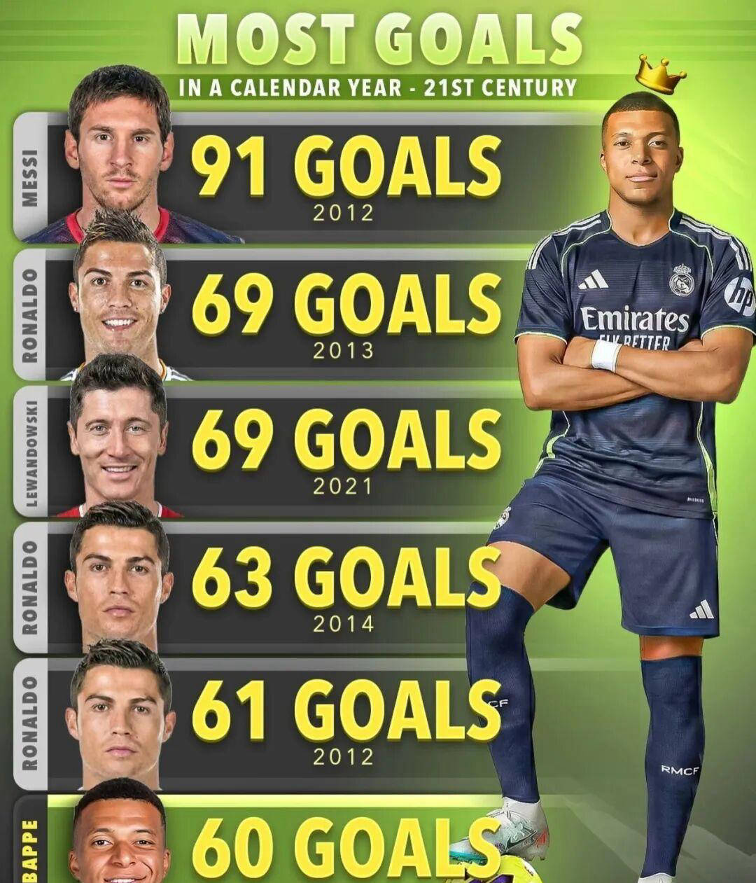 那么问题来了,接下来这五场比赛,姆巴佩能否完成10球的目标?为何选定10球这个数字呢?因为欧洲足坛有一个备受关注的经典排行榜——自然年个人正式比赛总进球数排名,该榜单由梅西与C罗领衔。历史数据显示,梅西2012年以91球高居榜首,遥遥领先于第二名C罗2013年创纪录的69球,两者相差整整22球。如今,姆巴佩正逼近这一传奇榜单,截至目前2025年前11个月,他已打入60球。如果在剩余比赛中能够凭此10球冲刺,将成功超越C罗,稳居仅次于梅西的第二位。